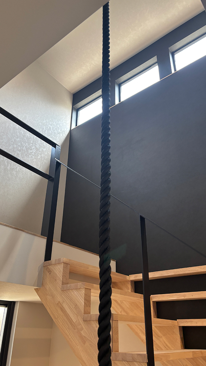 t邸では当初登り棒を計画しておりましたが、何度も打ち合わせを重ね、綱登り用ロープを採用しました。