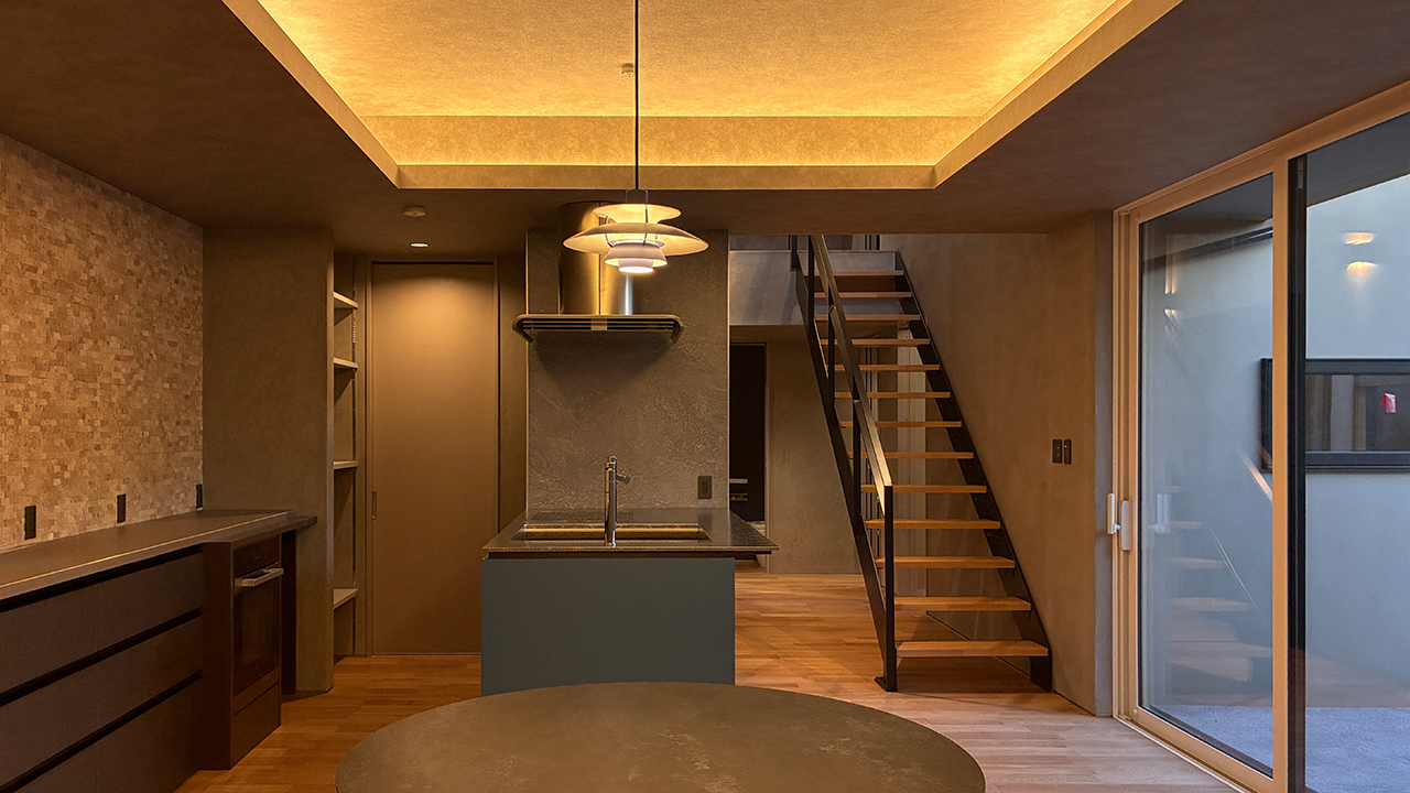 ・アイアン階段と間接照明の演出
